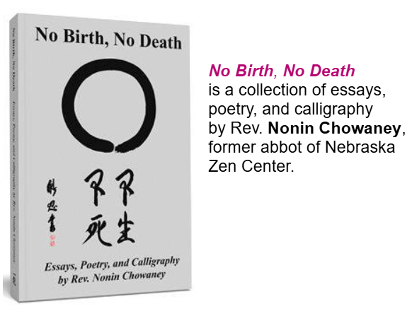 Tessho Michael D’Elia, one of Nonin’s students, has lovingly compiled Nonin’s essays, poetry, and art into a book called No Birth, No Death. The pieces in the collection were originally published in the Nebraska Monkey (1992–1996) and Prairie Wind (1996–2016) newsletters.